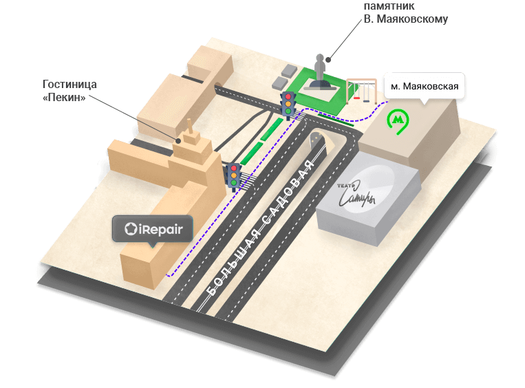 3 минуты от станции «Маяковская». Выход в город №4. Пересеките Триумфальную площадь слева, на ближайшем светофоре перейдите дорогу к зданию гостиницы «Пекин». Пройдите 180 метров